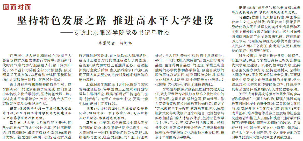 文章刊发在该报第五版的“面对面”栏目。在北京服装学院建校60周年之际,马胜杰就国庆70周年群众游行等服装设计对学校发展建设和人才培养带来的积极影响;60年办学历程中如何彰显行业特色、体现特色发展;在新的历史机遇面前,学校如何规划未来发展等相关问题做了深入阐述。