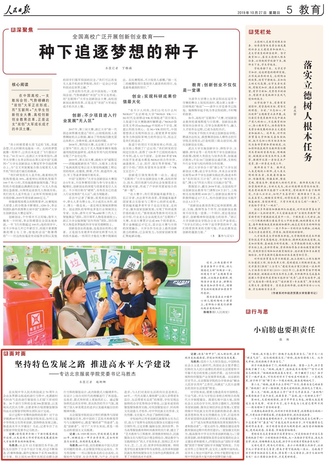 10月27日,《人民日报》刊发对我校党委书记马胜杰的专访文章,题目为《坚持特色发展之路 推进高水平大学建设——专访北京服装学院党委书记马胜杰》。