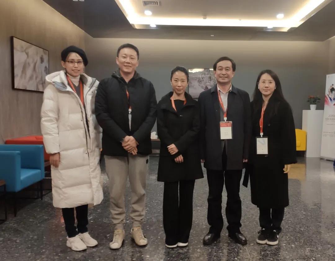 北京服装学院党委副书记倪赛力(右二)带领设计团队与中国花滑协会主席申雪(中)在2019中国花滑大奖赛上