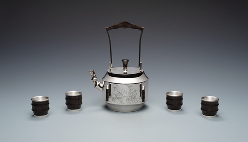 展览作品择取郑板桥艺术创作中的精粹,分为:竹石、简异、难得、关情四个专题,共四十二件/套作品。摹自郑板桥绘画作品的《竹石图》《兰梅竹菊图》《竹韵》等作品,壶体采用纯银锻造成型,部分辅以錾刻装饰,杯子采用黑檀木包银或双层银胎设计,审美与实用构成一体。“逍遥游·溟”石系列作品,采用传统的锡器工艺,实现了传统锡器造型与太湖石的天然融合。“逍遥游·鹏”“逍遥游·鸠”系列作品通过对器型的重新设计将当代艺术的表现方式介入金属工艺中来,对传统的典型锡器进行解构和转化,产生一种不安定且具有运动感的形态,进而体现传统与当代、手工与机械、学院与民间、东方与西方因素的融合。《模范》系列则采用传统匠人的石头制磨具浇铸而成,外部保留浇铸的表面肌理和铜烙铁焊接的痕迹,内部精工细作讲究实用功能,天然去雕饰的外表与精致适用的内核,体现板桥质朴的深刻意蕴。“些小吾曹州县吏,一枝一叶总关情。”板桥先生的“枝叶”情怀,也深深刻印在付少雄作品的灵魂里。本次展出的国家级大赛奖杯设计、京张高铁站金属壁画设计都具有浓郁的区域特色,体现了设计师清孤之外深沉温厚的入世情怀。